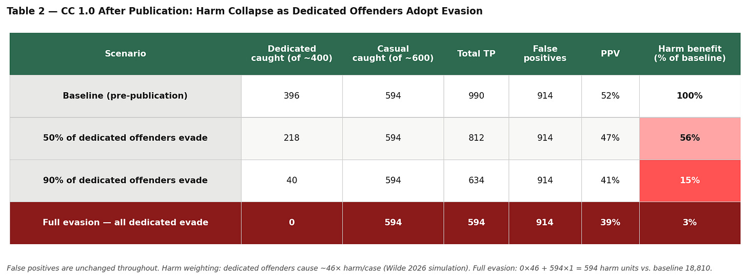 In my preprint, I modeled dedicated versus casual offender populations separately. Across the full parameter space, dedicated offenders dominate harm-weighted outcomes by a factor of 46 to 1. They are also, by definition, the people most likely to find and implement published evasion techniques. The policy adversaries have just handed them a gift.