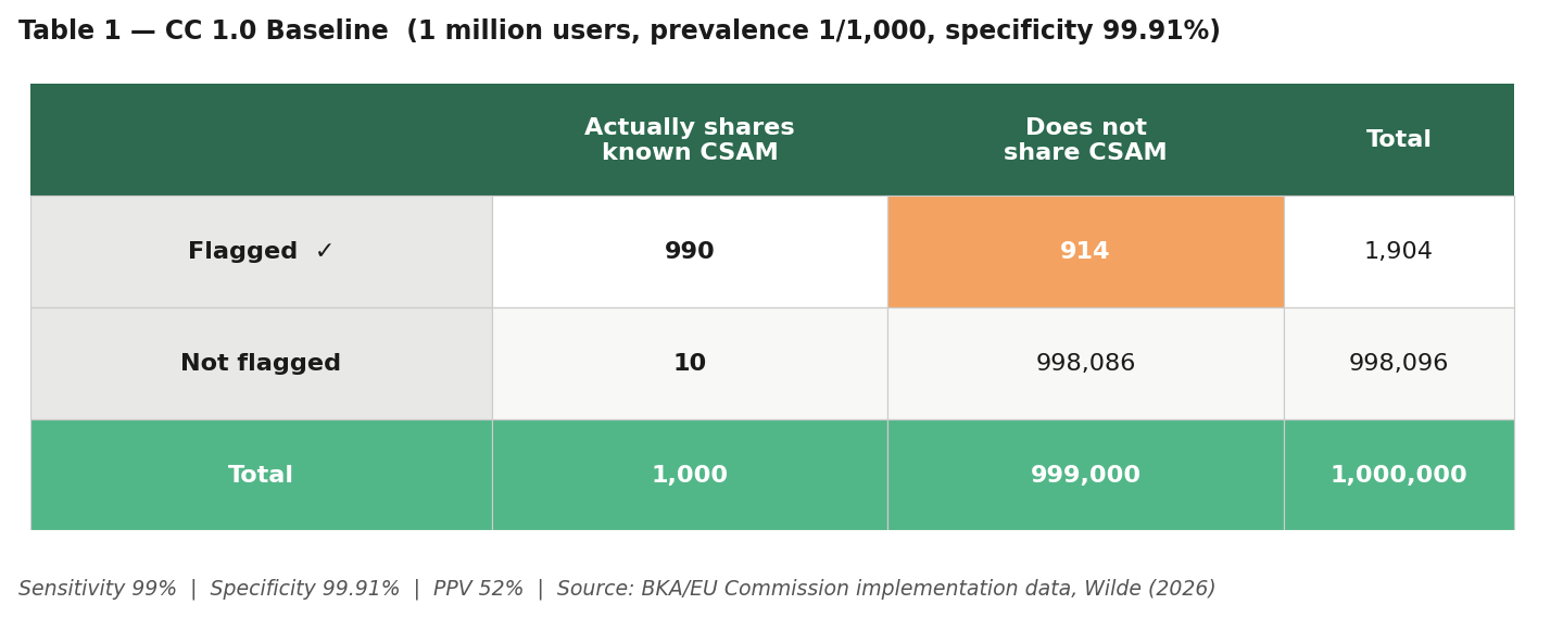 The table above shows estimated hypothetical outcomes for Chat Control 1.0 — existing EU mass scanning with PhotoDNA — before Deryck et al’s publication: roughly 1,900 flagged cases per million users, with about 914 false alarms and 990 real cases caught. A false alarm means a human reviewer looks at images, presumably finds nothing criminal, and closes the case. It’s a resource cost and a privacy violation — not a framing, because the evidence for a crime isn’t there when someone looks. PPV of 52% is worse than I originally estimated (my prior model assumed higher specificity), but manageable as a sorting task. It’s been tried and doesn’t seem to overwhelm investigative resources. So, from one possible child safety perspective, it worked.